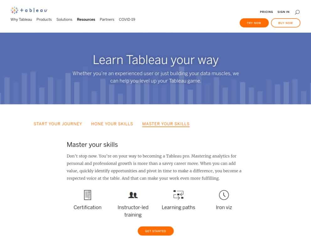 The Tableau team developed these resources, so you know they are high quality and useful. The Learning Center has three learning tracks, each of which offers starter dashboards, how-to videos, and user groups. These tracks were designed to help you start learning Tableau, build your skills, and eventually master the platform.